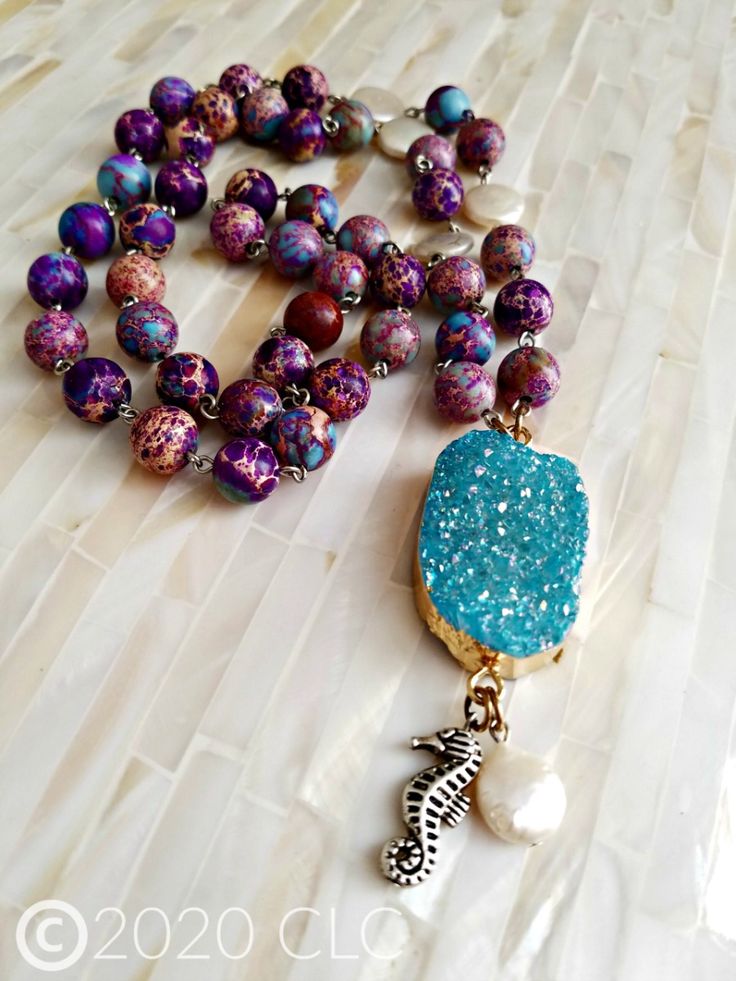 This beautiful necklaces measures 28″ long, Sea Sediment Jasper beaded chain, coin pearls, seahorse charm, gold plated natural druzy agate pendant stone. This piece is so versatile, would look great with summer dresses, tees, or swim/beachwear!